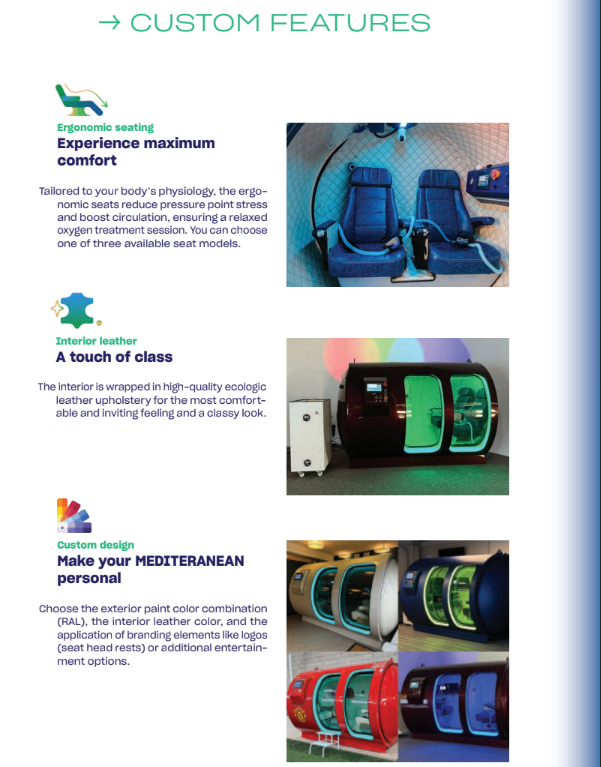Tailored to your bodys physiology, the ergonomic leather seats reduce pressure point stress and boost circulation, ensuring a relaxed oxygen treatment session. You can choose one of three available seat models.